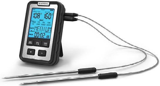 Monitor the whole cookout from outside the grill! Read two temperatures at one time. Monitor two cuts of meat or a roast and the ambient grill temperature. Integrated countdown timer and a wide range of target doneness for each cut of meat or set your own target.Read More
