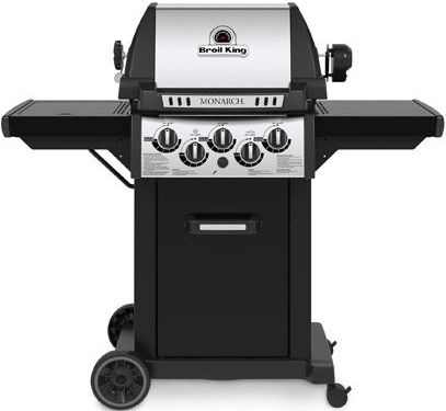 The Monarch™ 390 features 330 sq. in. primary cooking surface and includes 3 stainless steel Dual-Tube™ burners, reversible heavy-duty cast iron cooking grids, stainless steel Flav-R-Wave™ cooking system, and electronic ignition. The Monarch™ 390 features painted steel drop-down side shelves and enclosed cabinet base.