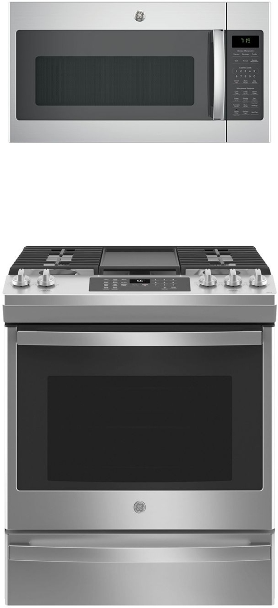 GE® 2 Piece Stainless Steel Kitchen Package with slide-in gas range and over the range microwave.Read More