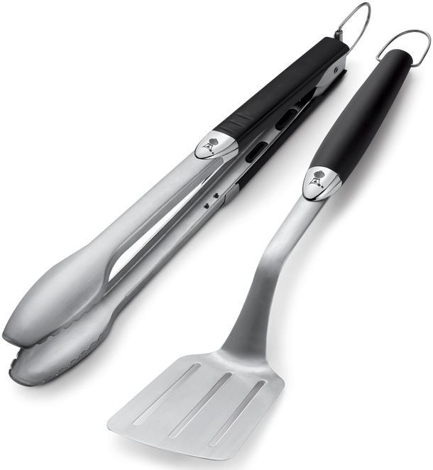 A spatula and tongs go together like salt and pepper. Whether flipping burgers, turning hotdogs, or transferring beer can chicken from tray to cooking grates, the angled spatula and hands-free locking tongs in the Premium Tool Set are two of your everyday grilling essentials.