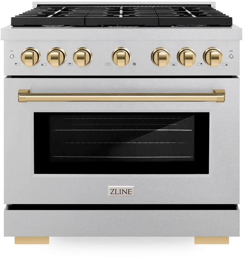 The ZLINE Autograph Edition 36 in. 5.2 cu. ft. Paramount Dual Fuel Range with 6 Burner Gas Cooktop and Electric Convection Oven in Satin Stainless Steel with Polished Gold Accents (SDRSZ-36-G) combines the versatility of a gas cooktop with 6 Italian-made auto-reignition burners, an electric convection oven with digital thermostat technology, enhanced cast iron grates, a Horizon oven door window design, and elegant polished gold knobs and handle allowing you to master every meal.