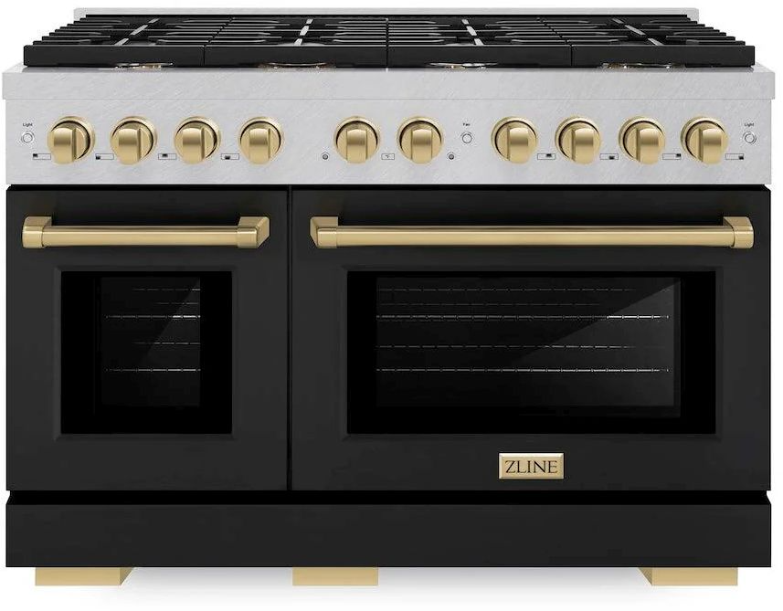 The ZLINE Autograph Edition 48 in. 6.7 cu. ft. Paramount Double Oven Gas Range with 8 Burner Cooktop in Satin Stainless Steel with Black Matte Doors and Champagne Bronze Accents (SGRSZ-BLM-48-CB) features a versatile gas cooktop with 8 Italian-made auto-reignition burners, a large high-performing gas convection oven, a small baking oven, enhanced cast iron grates, beautiful black matte doors with Horizon window designs, and elegant champagne bronze knobs and handles allowing you to master every meal.